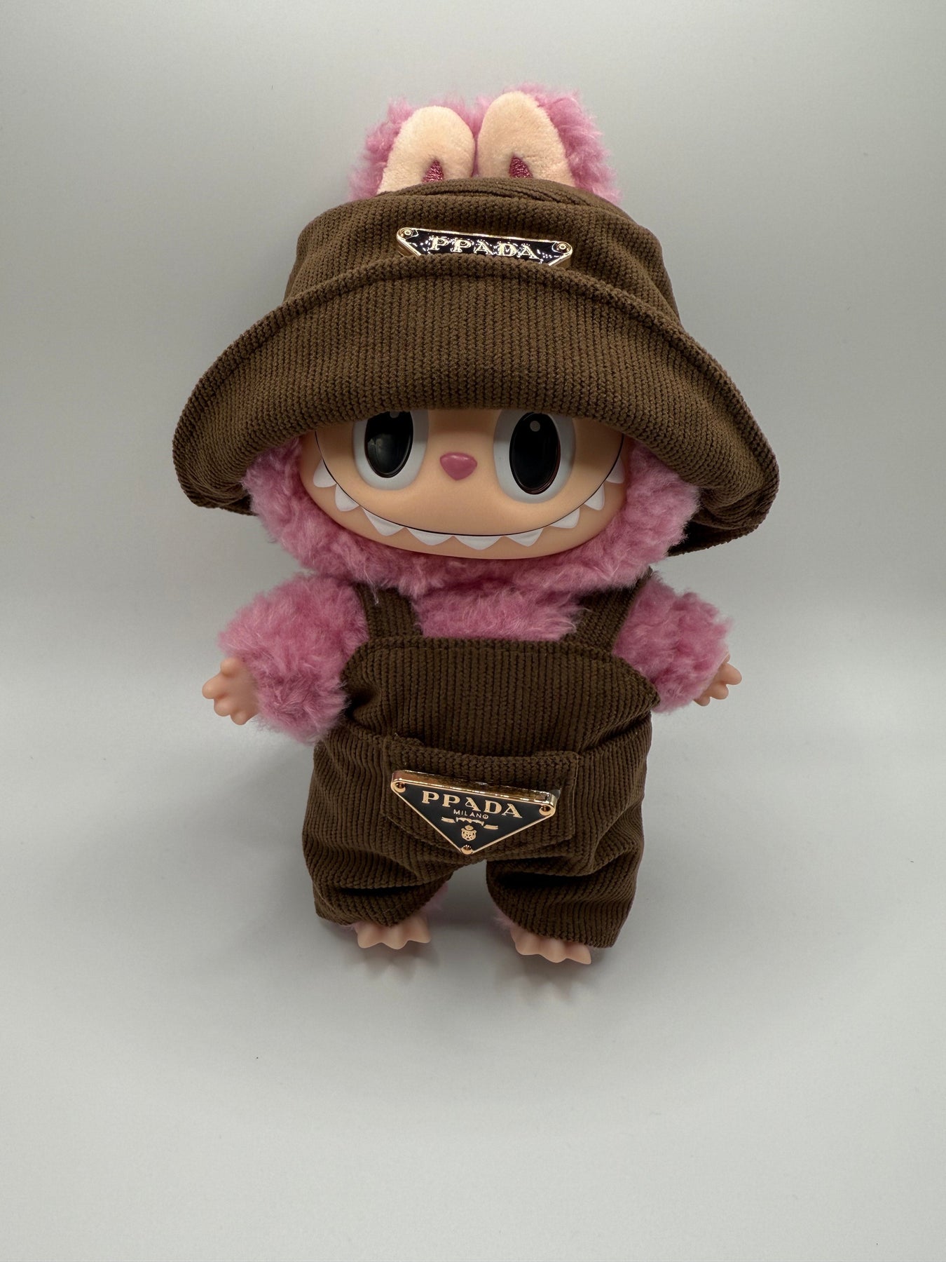Dress your Labubu in this adorable Brown Bucket Hat & Overall set, perfectly tailored for standard-size Labubu figures. The outfit includes a soft bucket hat in brown and a pair of mini overalls.
